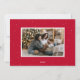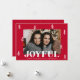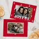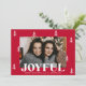 Festive photo Christmas card featuring your horizontal photo surrounded by white hand-drawn pine trees with a red background. "Joyful" is displayed in bold white lettering with your custom greeting and family name shown below. The joyful Christmas card reverses to display an additional photo and a red background with subtle white dots.