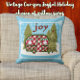 A sweet vintage camper trailer sits on a white snow covered slope . The festive camper is red and white checked. A holiday wreath is pinned to the door. The two windows are adorned with red curtains and green and white awnings. Each window has a flower box filled with Poinsettias and holly. Green pine trees surround the camper, one of which is decorated with strings of light and colourful holiday ornaments. A red star sits atop the decorated tree. The background Is a light blue sky filled with snowflakes. Add some extra Merry to your holiday season with this especially cute festive throw pillow. It's available in different sizes and materials.
