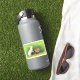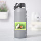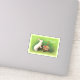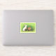 This vinyl sticker has a white rabbit pushing a wood wheelbarrow filled with straw and coloured Easter Eggs on a dark green background framed in light green with the text Joyous Easter.