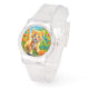 I only have one complaint. I ordered the watch with clear case and strap, and what was sent was white case and strap. I'm going to keep it because 1) it looks very nice in white, and 2) it would take too long to get a replacement made and sent in time for my occasion. Aside from the mix up with the color, the watch does look very good in white. The purple dial is actually sparkly which did not show in the online images. That was a nice surprise. If you like Swatch watches this is very similar to those. It's 33.6mm in diameter, 10.5mm thick, and 40.6mm lug to lug. Stainless steel case back says 3ATM/30m WR, so no swimming or showering or submerging this one. If you like Woodstock, this is a great choice.