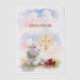 A soft watercolor composition featuring a resting lamb beside traditional red Pascha eggs beneath a radiant golden cross. Gentle washes of blue and blush create an airy sky, while warm light surrounds the cross, symbolizing the Resurrection. The painterly textures and luminous glow evoke a peaceful, devotional atmosphere inspired by Christian Paschal imagery.