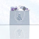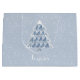 The Joyoux Noel design in pastel blue. A gift bag with silver trimmed Christmas trees, and a snowfall background. Designed with your holiday gifts in mind.