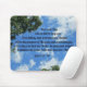 Beautiful blue sky with puffy clouds and green tree branches in foreground, with Bible Verse of benediction: Now unto Him who is able to keep you from falling, and to present you faultless before the presence of His glory with exceeding joy, to the only wise God our Saviour, be glory and majesty, dominion and power, both now and ever. Amen. Jude 1:24-25
