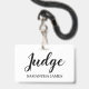 Trendy script typography judge name badge for competitions and contests.