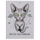 This whimsical cartoon illustration features a pale gray Sphynx cat with glowing green eyes, seated gracefully in a cosmic, dark space scene. Two gray UFOs shine beams on the cat, creating a playful yet mysterious vibe. Humor shines through the caption “NOT A CAT.. STILL JUDGING YOU.” Perfect for cat lovers, sci-fi fans, and anyone who enjoys quirky, modern space-themed art. Eye-catching, fun, and unforgettable.