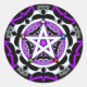 Fifteen crows around a white pagan pentacle on a field of purple with central purple jewel. Jewels representing the elements with silver celtic triquetra knotwork.