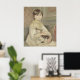 Julie Manet by Pierre-Auguste Renoir, oil on canvas 1887, is a half-length portrait painting of a young girl with short brown hair, soft round features, and elegant, patterned white dress seated on a sofa with a sleeping cat cradled in her arms. The subject was the daughter of Impressionist painter Edouard Manet.