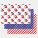 Celebrate Independence Day with these colourful wrapping paper sheets in three patriotic designs: (1) a pattern of red, white, and blue floral bouquets on a white background, (2) a white star pattern on a blue background, and (3) red and white diagonal stripes. Also ideal for a July 4th-themed birthday party or baby shower.