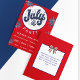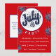 Cute medallion with a blue bubble letter July 4th appears on the front of this fully customizable party invitation with red and blue fireworks. The reverse of this invitation has a place to customize additional information for your guests.