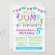 Jump birthday bash invitation, pink, teal, green and purple colour scheme suitable for any age. Add your own wording into the template, to more customisation (font colour, font style, background), click on personalise, scroll down and click on link "click to customise further".