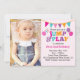 Our colourful Jump & Play Balloons photo style invitation in pink and purple colours features colourful letters, patterns and balloons and makes a perfect invitation for any child's party with a bounce house, trampoline or jump and play theme.