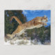 Animal card showing an imposant cougar jumping in the wilderness. The cougar (Puma concolor), also commonly known as the mountain lion, puma, or catamount, is a large felid of the subfamily Felinae native to the Americas. Its range, from the Canadian Yukon to the southern Andes of South America, is the greatest of any large wild terrestrial mammal in the Western Hemisphere. An excellent stalk-and-ambush predator, the cougar pursues a wide variety of prey. Primary food sources include ungulates such as deer, elk, moose, and bighorn sheep, as well as domestic cattle, horses and sheep, particularly in the northern part of its range. It will also hunt species as small as insects and rodents. This cat prefers habitats with dense underbrush and rocky areas for stalking, but can also live in open areas.