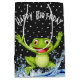 Happy green frog jumping out of blue water on white polka dot pattern and black background.