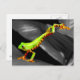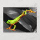 Acrobatic lime green tree frog with orange and black stripes on its belly, looks like he’s doing a handstand. Very colourful leaping amphibian on a black and white background.