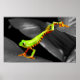 Acrobatic lime green tree frog with orange and black stripes on its belly, looks like he’s doing a handstand. Very colourful leaping amphibian on a black and white background.