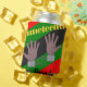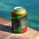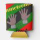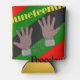 This can cooler has a Juneteenth design of hands in broken chains with a background of red, yellow, green, and black lines.
