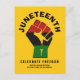 JUNETEENTH Celebrate Freedom Postcard with stylish Freedom Power Fist in Pan African colours of red, black and green, with a black drop shadow and vibrant yellow background. The curved heading says JUNETEENTH in bold black typography. The text underneath says CELEBRATE FREEDOM plus NEVER AGAIN BOUND BY THE YOKE OF SLAVERY and this quote is based on the Christian Bible verse Galatians 5:1. This text is CUSTOMIZABLE so you can replace with your name or with your own inspirational quote. This Pan African Juneteenth Postcard would make an ideal gift for Juneteenth, Christmas, Birthdays, Black History Month, and throughout the year whenever Black independence and African American Caribbean cultural pride are celebrated. Choose from a wide selection of Juneteenth designs on clothing, home decor, cards and gifts, original designs by Berean Designs.