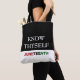 JUNETEENTH Know Thyself Tote Bag, showing red, black, green and white typography that says KNOW THYSELF - JUNETEENTH. The word JUNETEENTH appears in red, black and green bold typography. This design is repeated on the back. This design is inspired by the famous KNOW THYSELF quote by SOCRATES to encourage people to increase their knowledge of Juneteenth and to celebrate Black history. Ideal for woke supporters of cultural African American Caribbean celebrations, and would make a great gift for Juneteenth, Christmas, Birthdays, Black History Month and throughout the year. Choose from a wide selection of Black History Month and Juneteenth designs and matching gifts, designed by Berean Designs exclusively for Zazzle. Matching gifts available.