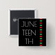 A Juneteenth celebration button. The button is red, black, and green with the background in black with white letters.