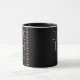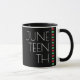 A Juneteenth celebration coffee mug. It has a design including a black background, a red, black, and green stripe, and the letters are in white.