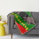 This throw blanket has a Juneteenth design of hands in broken chains with a background of red, yellow, green, and black lines.