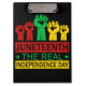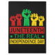 Social justice and Black History word art design features raised fists with "Juneteenth - the Real Independence Day" text in Pan Africa colours combo on black background. Change the inside paper type from sketchbook to ruled, grid or even recipe pages