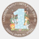 Unique round address label sticker featuring a big blue one surrounded by adorable jungle safari animals set on a rustic brown wood background.