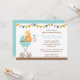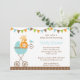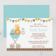 Adorable baby shower invite featuring a lion and giraffe sitting in a blue dot stroller with festive bunting on the top.