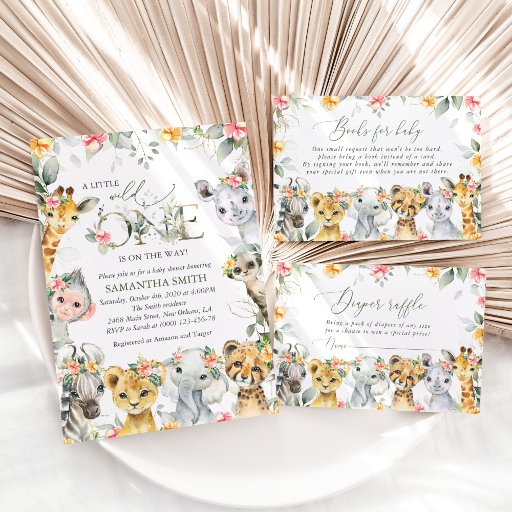 Add a personal touch to your baby shower celebration with these stylish and memorable party items! Design features jungle animals (giraffe, zebra, lion, elephant, cheetah, rhino), hibiscus flowers and eucalyptus leaves on white background.