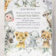 Invite friends and family in style and set the tone for your special day with this charming baby shower invitation. Design features jungle animals (giraffe, zebra, lion, elephant, cheetah, rhino) and eucalyptus leaves on white background.