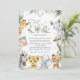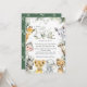 Invite friends and family in style and set the tone for your special day with this charming baby shower invitation. Design features jungle animals (giraffe, monkey, zebra, lion, elephant, cheetah, meerkat, rhino) and eucalyptus leaves on white background.