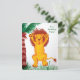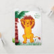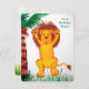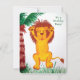 Cute happy lion with palm tree for juvenile birthday party invitation.