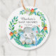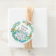 Cute jungle elephant baby shower favour tag featuring a blue elephant framed with jungle leaves.