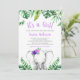 Adorable purple girl elephant baby shower invitation design featuring watercolor tropical leaves and baby elephant.