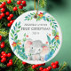 Cute baby's first Christmas ornament the sweetest little elephant framed with watercolor jungle leaves.