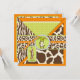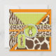 Safari prints, giraffe, zebra, and cheetah and a polka dot pattern, with monkey hanging on a vine and 3D look tags, bows, trims first birthday invitation card.