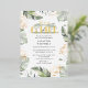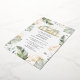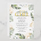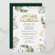 Wild, calm, and elegant safari animal baby shower invitation featuring a giraffe, gold effect and green leaves.