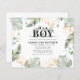 Wild, calm, and elegant boys safari animal baby shower invitation featuring a giraffe, gold effect and green leaves. Perfect for boys baby shower invitation. Also, add your return address on the reverse side to create your very own budget postcard