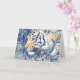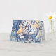 A striking close-up of a tiger with piercing blue eyes, depicted in a bold watercolor style with deep blue and warm orange hues. The tiger’s face is surrounded by bamboo leaves, creating a lush jungle atmosphere. The intricate brushstrokes and expressive contrast between light and shadow give the image a dynamic and artistic feel. This design captures the beauty and strength of the majestic tiger in a stylised yet elegant composition.