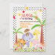 PixDezines jungle theme for a fun birthday bash. Featuring baby animals, pink hippo, a purple elephant, yellow polka dots giraffe, tiger cub as well as a cheeky little brown monkey riding on an elephant head. Zebra print is a finishing touch on the background.