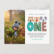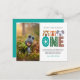 Modern, trendy boy first birthday thank you postcard. Design featuring jungle animals and number one in trendy colorful lettering , thank you message and a photo.