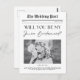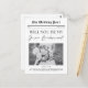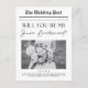 This proposal newspaper postcard is the perfect way to ask "Will you be my Junior Bridesmaid?" Featuring a black and white minimalist style with the masthead "The Wedding Post" and a photograph of a bride holding a bouquet of flowers (you can keep this photo, or swap it for one of your own!). With an elegant, simple design it adds a personal touch to your bridal party proposals. It's easy to customise with your bridesmaid's name and a personal message.
