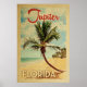 A uniquely retro mid-century modern Jupiter Florida art print in vintage travel poster style. It features a curved palm tree on sandy beach with ocean under a blue cloudy sky.