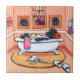 "Just 5 More Minutes" depicts a Portuguese Water Dog relaxing in the tub surrounded by monogramed towels, special soaps and a wall of self portraits. This is a picture of utter self-indulgence. Inks and coloured pencils. (c)2014 Andie.
