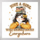 Charming illustration featuring a girl leaning on a stack of books and a stack of books on her head. The colourful text reads: "Just a girl who brings books everywhere". This design is available on a wide variety of products.