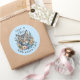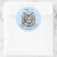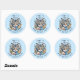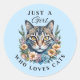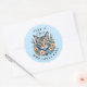 Cute watercolor grey brindle cat surrounded by pink and blue flowers.
