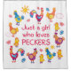 Cute colourful cartoon drawing of chickens with funny witty remark saying: Just a girl who loves peckers