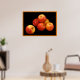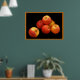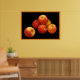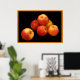This poster features a very simple still life composition of six beautiful shiny red and yellow apples against a black background.