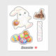 Cute, assortment of Easter stickers, features bunny with basket, two small bunnies, group of coloured eggs and the word Easter in a floral design. Great to use these custom-cut stickers for Easter decorations, scrap booking and more!