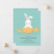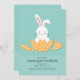 A cute birth announcement featuring a white bunny hatching out of a gold, polkadot egg with a teal, heart-patterned background.